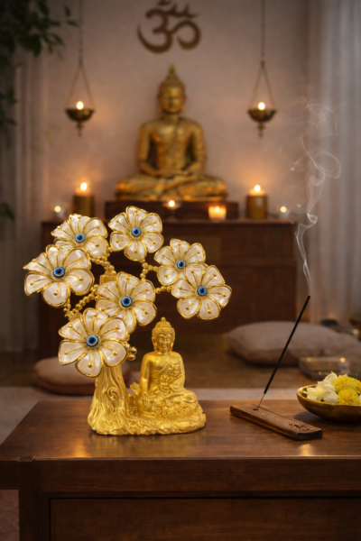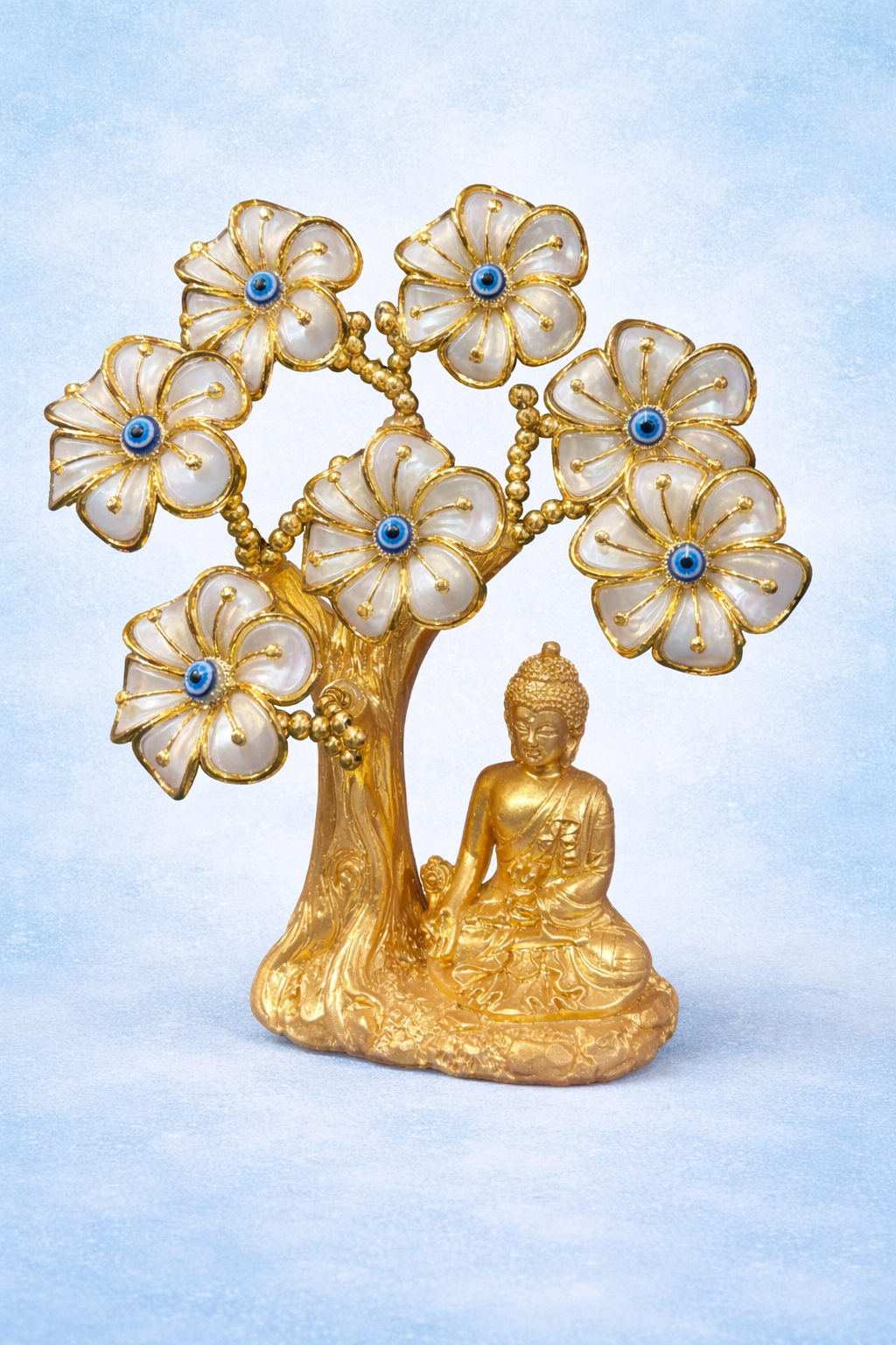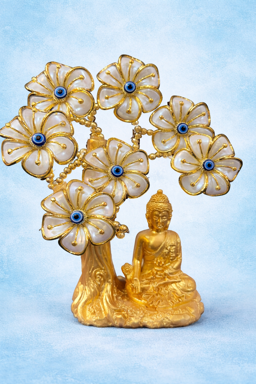 Evil Eye Golden Buddha Under Floral Tree – Spiritual Home Decor